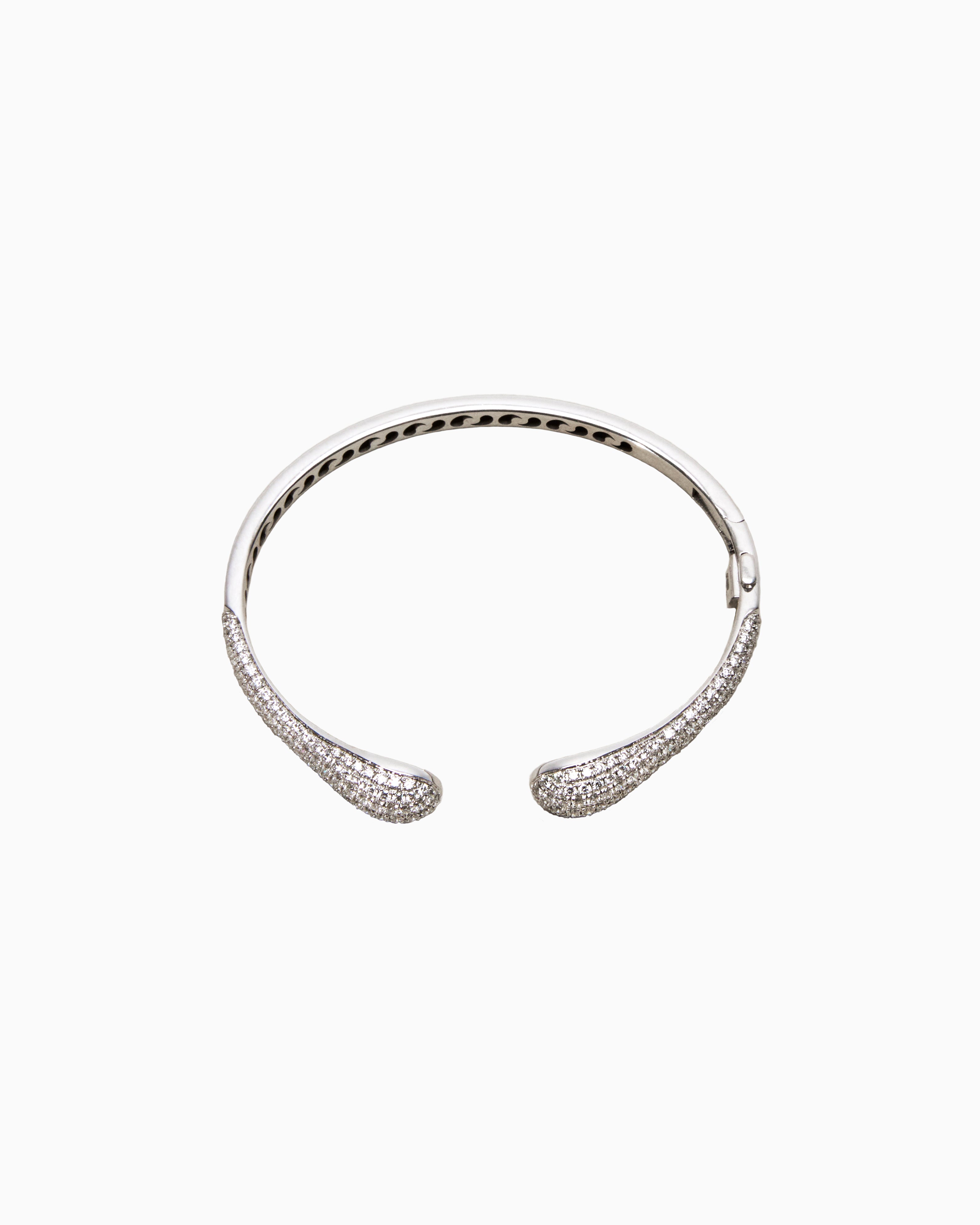 Sleek, sculptural, and endlessly refined, the Aurum Curve bracelet is a celebration of modern elegance. Crafted in 18K white gold, this open cuff is adorned with brilliant-cut diamonds. With a total carat weight of 5.0 ct, the diamonds exhibit exceptional sparkle, rated VS clarity and Top Wesselton color.