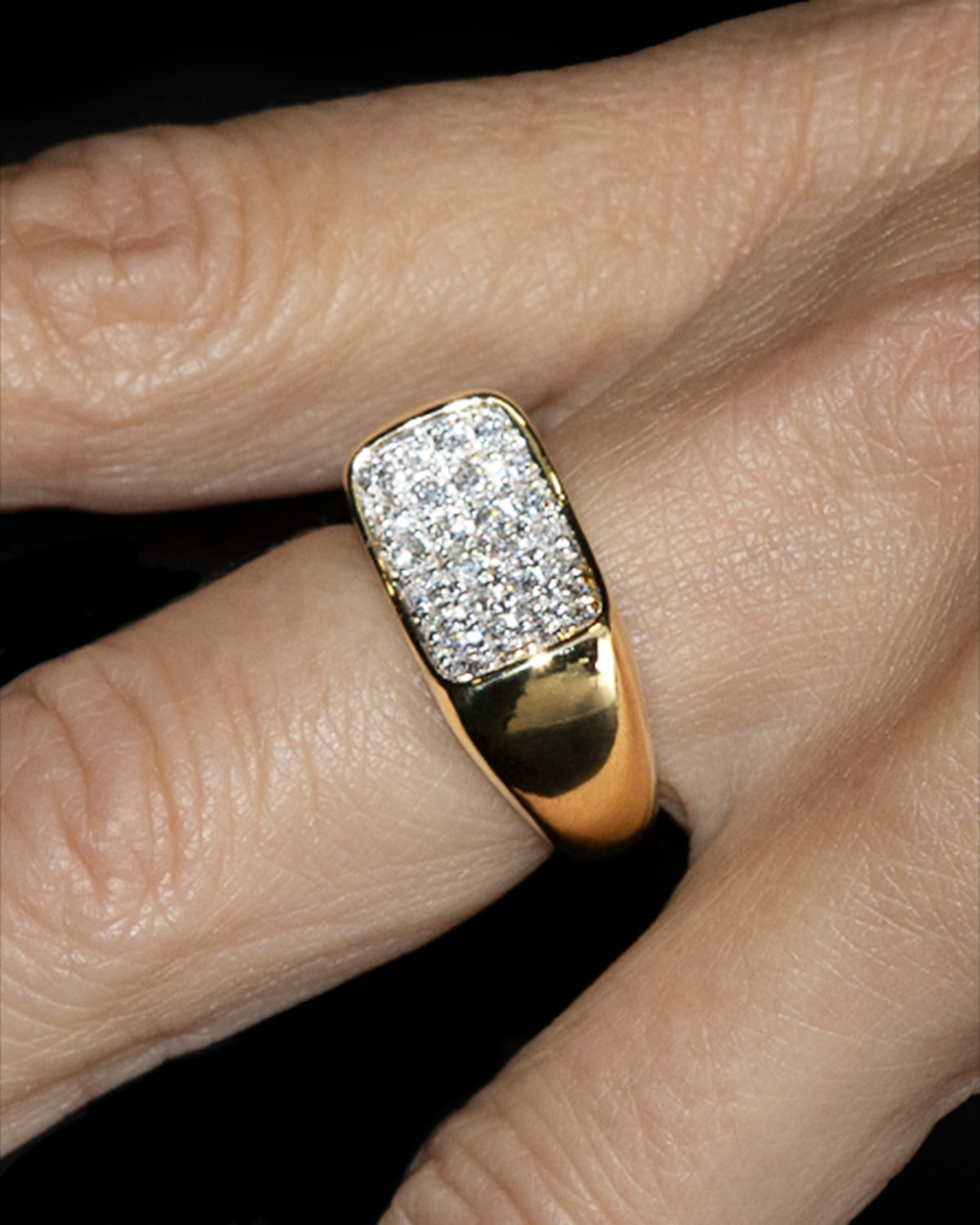 Auryn is a vintage ring crafted in 18K red gold and set with 0.56 ct brilliant-cut diamonds in VS clarity and TW color. A warm, bold piece with timeless weight and glow. One of a kind – and unforgettable.