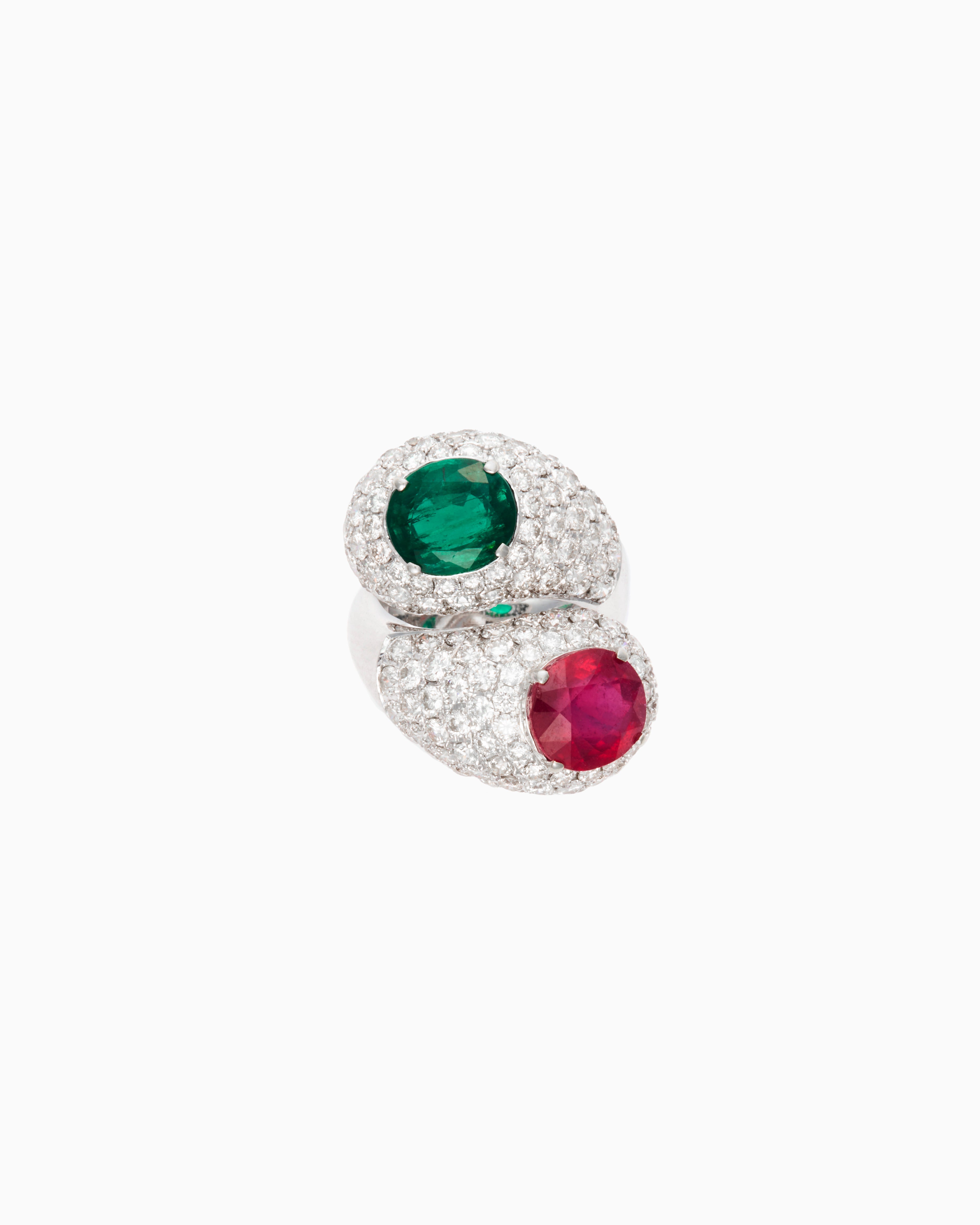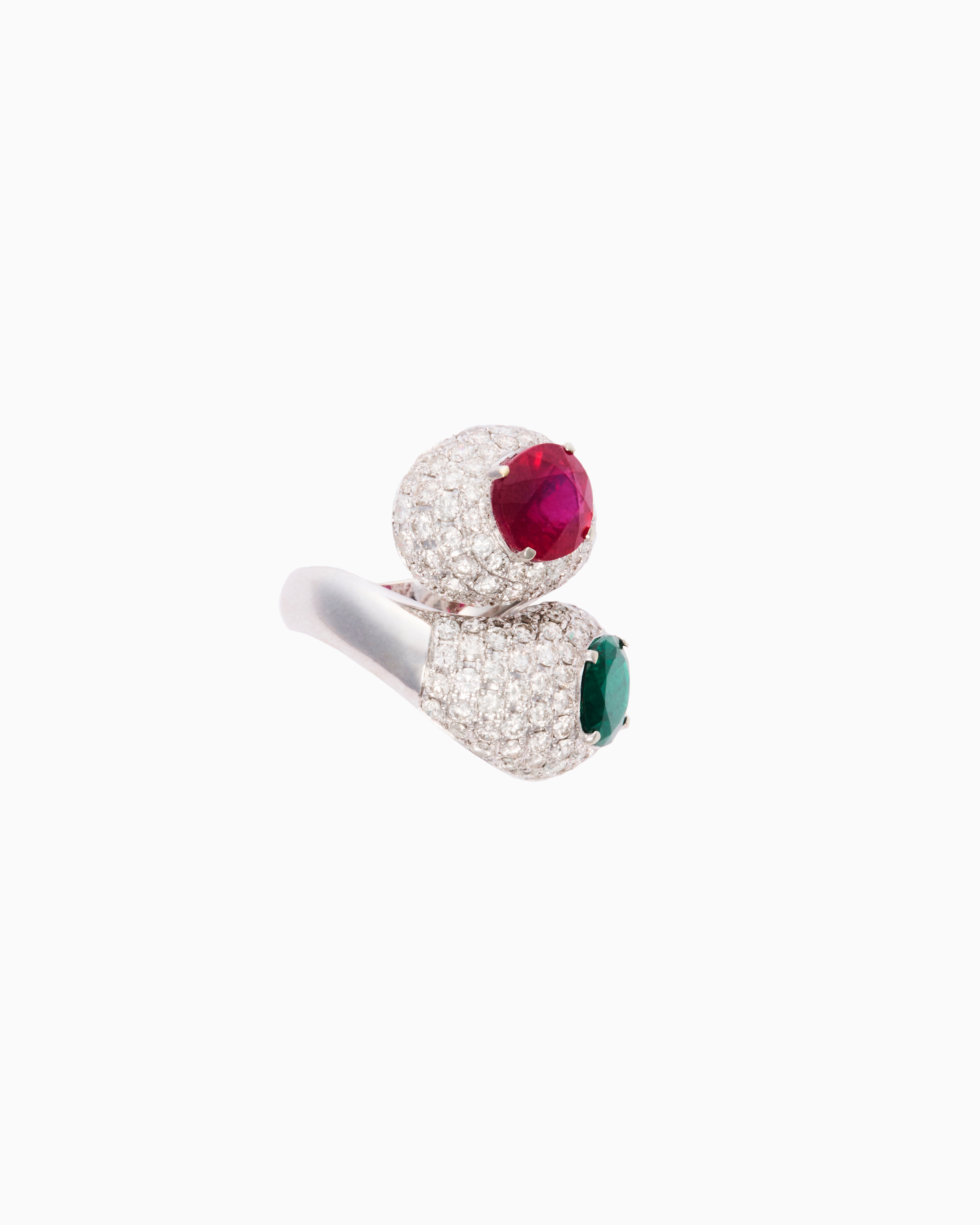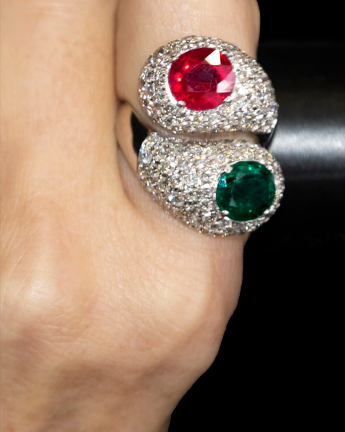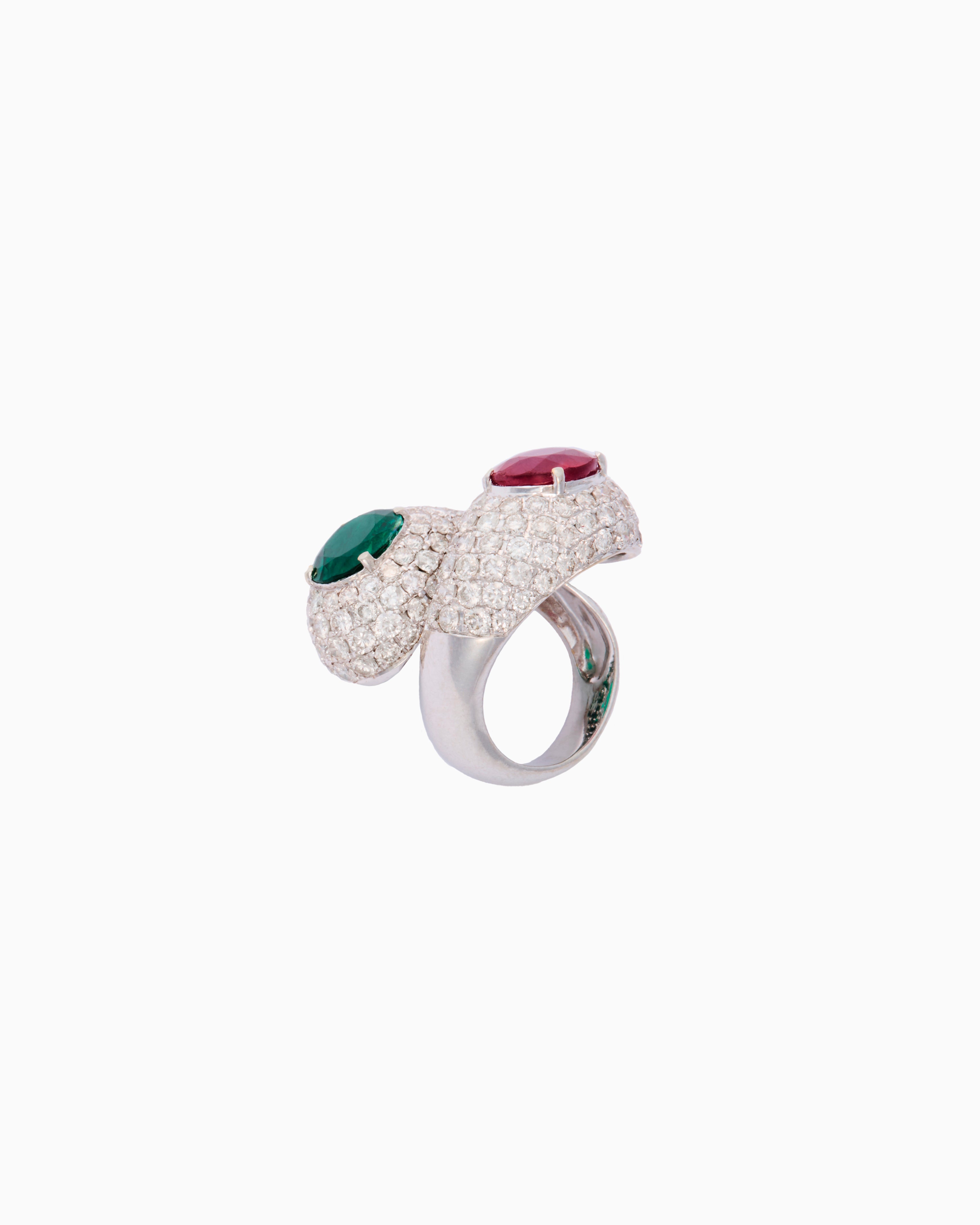Furia – crafted in 18K white gold with 4.50 ct brilliant-cut diamonds, paired with two synthetic gemstones in emerald and ruby tones.