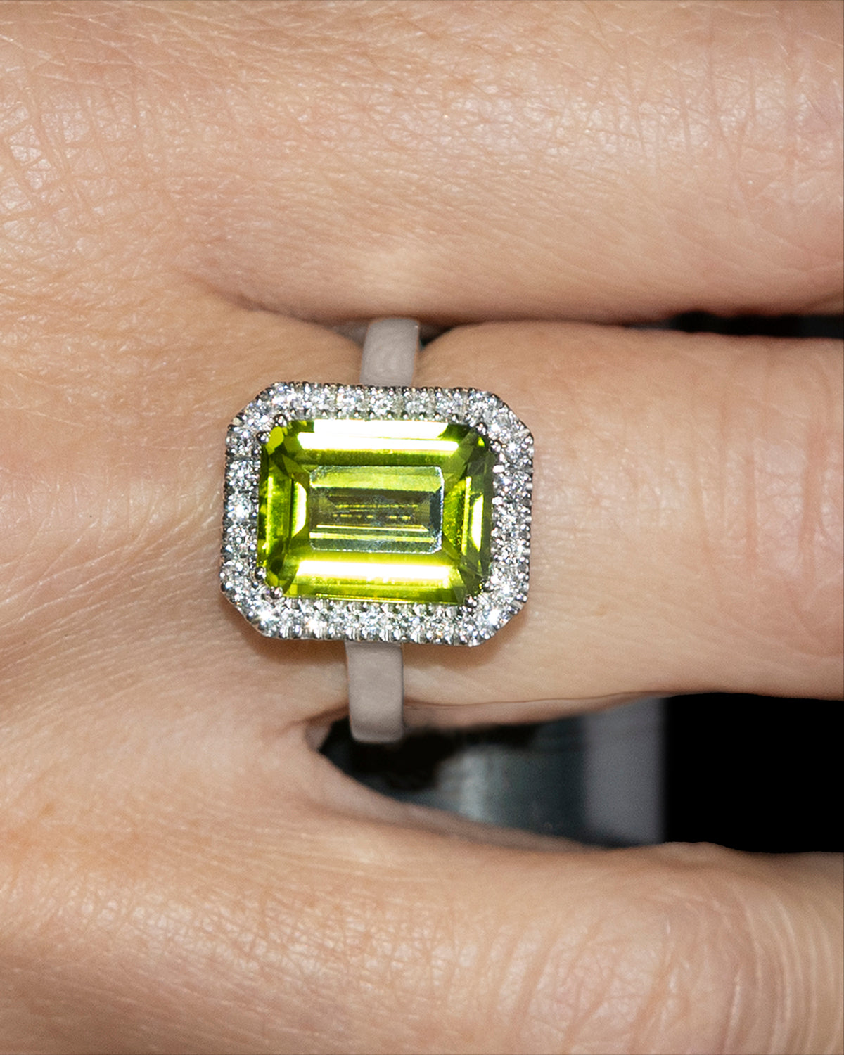 A dramatic vintage showpiece with a Peridot stone from Burma, framed with diamonds. This ring blends colour, clarity and elegance into a confident and unforgettable statement.