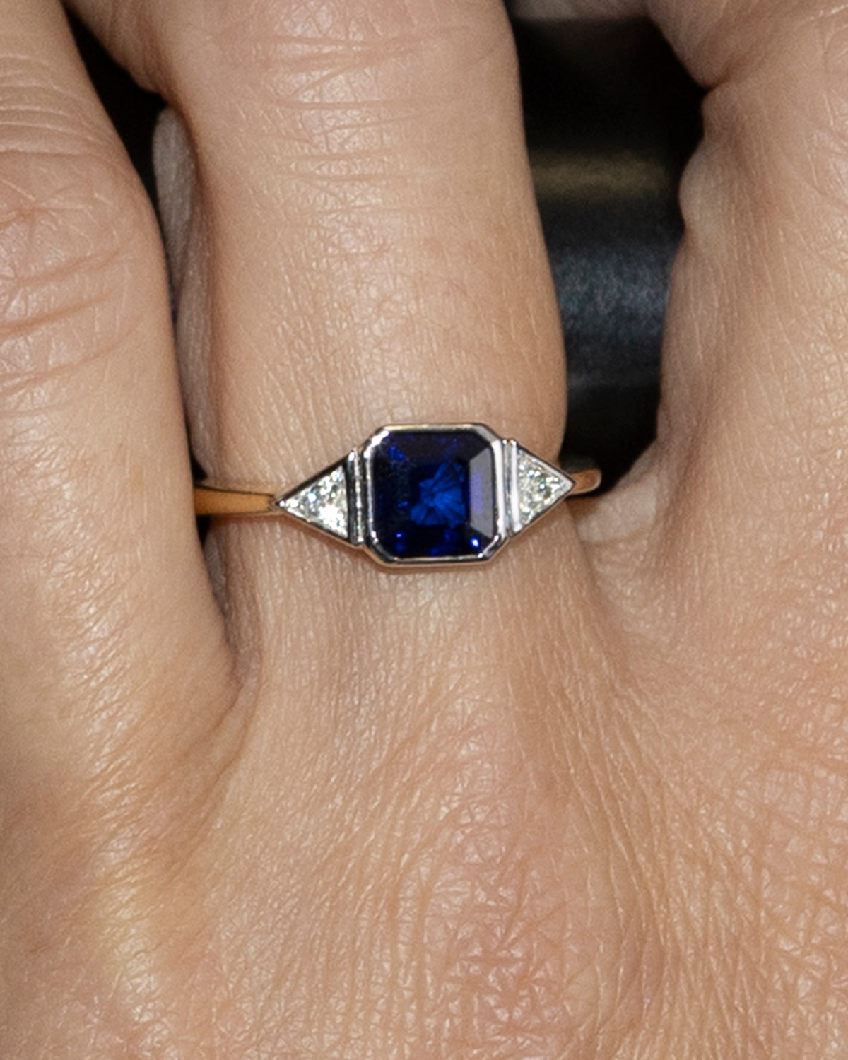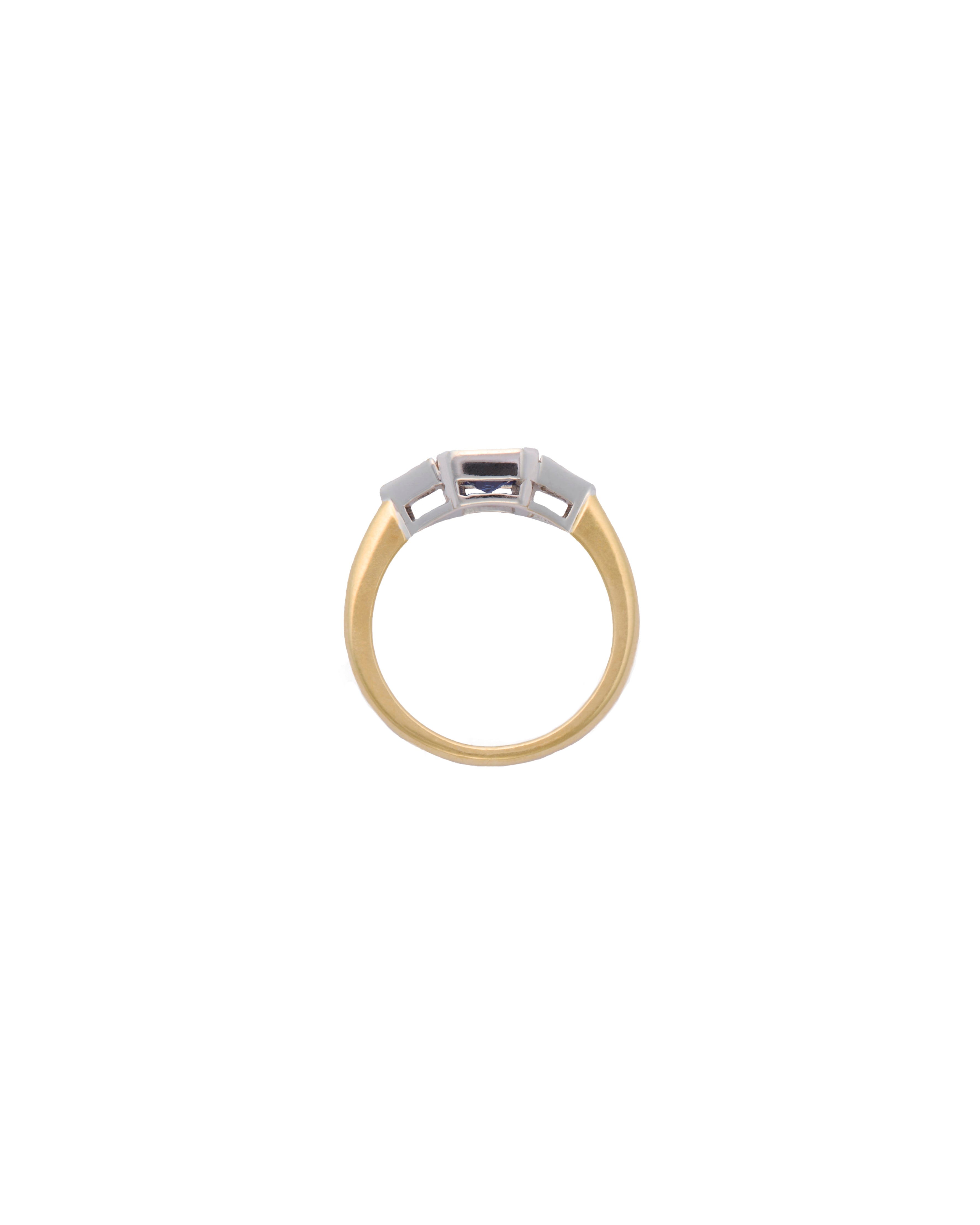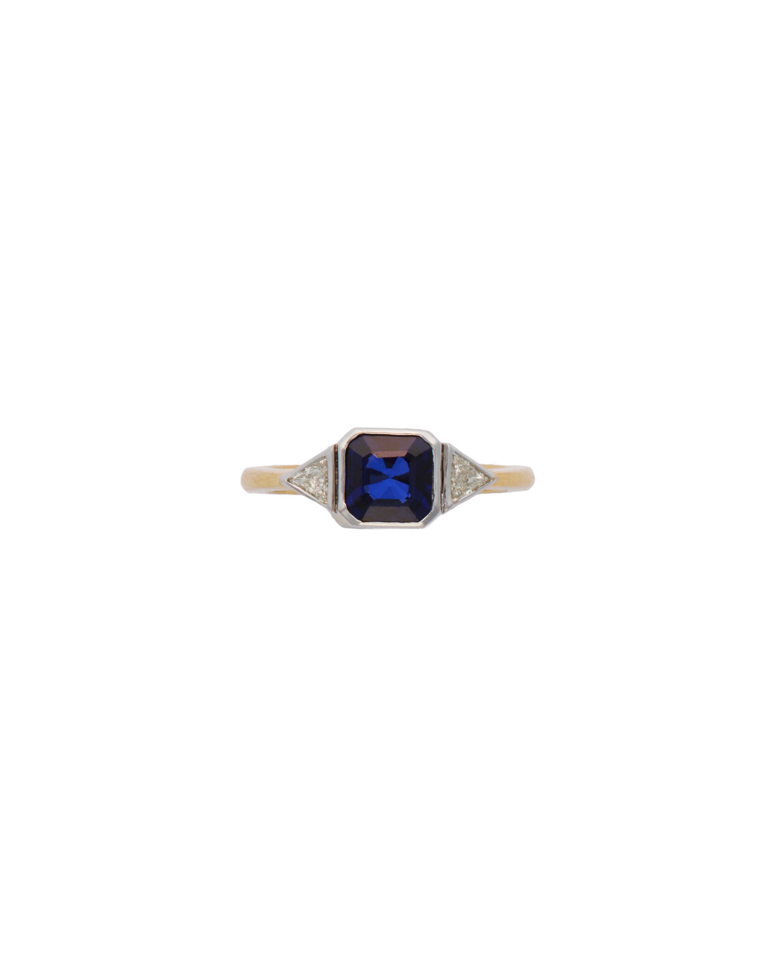 Zarielle is a vintage ring crafted in red and white 18K gold, featuring a 1.20 ct carré-cut sapphire and 0.30 ct trillion-cut diamonds. A stunning balance of color, geometry, and strength. Flanking the sapphire are two dazzling trillion cut diamonds adding a modern, sculptural brilliance to this timeless piece.